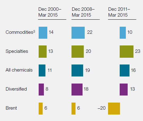 بر اساس عملکرد این بخش از سال 2000 تاکنون، محصولات شیمیایی همچنین بالاترین بازدهی کل سهامداران را در زنجیره ارزش این صنعت دارد: صنعت تولید محصولات پتروشیمی بالاترین میزان بازدهی کل سهامداران را در بین صنایع بالادستی دارد که خوراک این بخش را تامین می کنند، مانند بخش های نفت، گاز و مواد معدنی؛ علاوه بر این بازدهی کل سهامداران این بخش از صنایع پایین دستی که محصولات این بخش را مصرف می کنند، مانند صنعت خودروسازی، بخش کالاهای مصرفی و محصولات داروئی، نیز بالاتر است (نمودار 3).