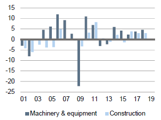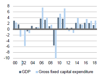 این سوال که آیا مخارج سرمایه بخش خصوصی و دولت کافی بوده است یا نه یکی از داغ ترین بحث ها در سال های اخیر بوده است. نگاهی به حساب های ملی نشان می دهد که مخارج ناخالص سرمایه در سال های 2010 تا 2018 به طور متوسط 5/2 درصد در سال افزایش یافته است که به این ترتیب نرخ رشد تولید ناخالص داخلی (8/1 درصد در سال) را پشت سر گذاشته است. بر اساس قیمت های تعدیلی، سرمایه گذاری در ماشین آلات و تجهیزات به طور متوسط 7/2 درصد، سرمایه گذاری در ساختمان 2/2 درصد و سایر مخارج سرمایه ای به میزان 3 درصد افزایش یافته است.
