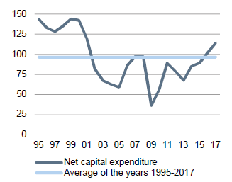 بدون استفاده از یک سناریوی مرجع، که بر اساس چارچوب های هنجاری ضروری است، پاسخ دادن به این سوال که آیا واقعا میزان مخارج سرمایه ای ناکافی است بسیار سخت خواهد بود. نگاهی به خالص مخارج سرمایه ای (مخارج سرمایه ای ناخالص منهای استهلاک) بینش بهتری نسبت به موضوع به ما خواهد داد. در حالی که خالص مخارج سرمایه ای برای چهارمین بار متوالی از سال 2017 (ارقام سال 2018 هنوز در دسترس نیستند) افزایش یافته است، بین سال های 2010 و 2015 کمتر از متوسط بلندمدت بوده است.