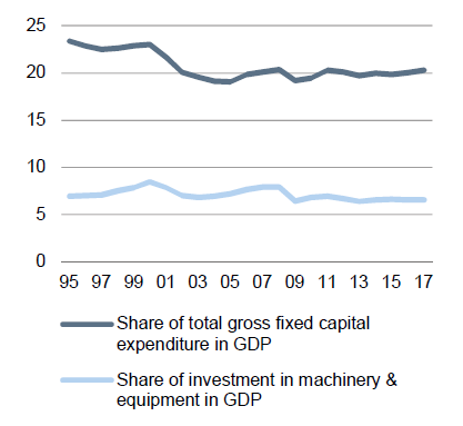 نسبت سرمایه گذاری (یعنی سهم مخارج سرمایه گذاری از کل تولید ناخالص داخلی) نیز بین سال های 2010 و 2017 کمتر از نرخ متوسط بلندمدت بوده است. این هم در مورد کل مخارج سرمایه ای ناخالص و هم در مورد سرمایه گذاری در ماشین آلات و تجهیزات کاربرد دارد (نمودار 4 را مشاهده کنید).
