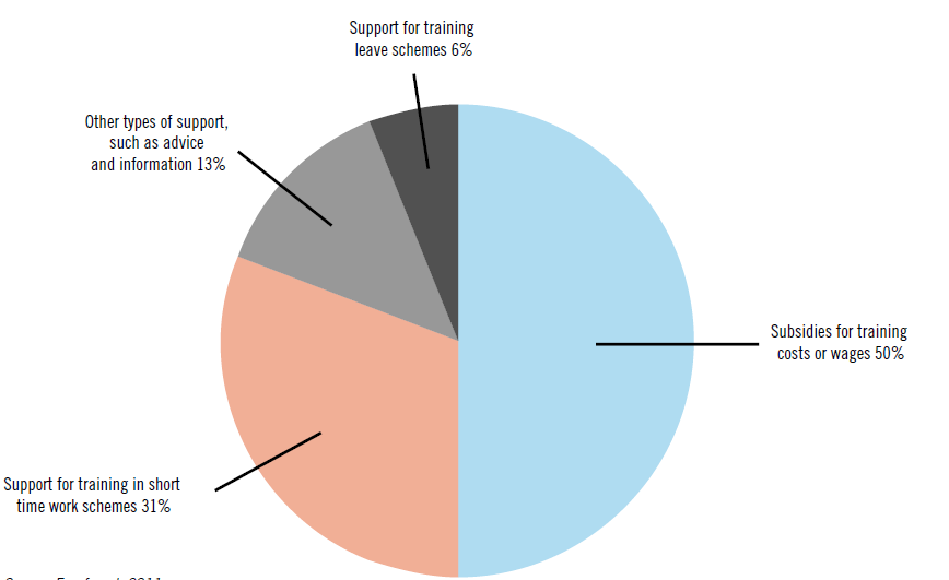 خدمات آموزشی برای کسانی که در بخش خصوصی شاغل بودند فقط در صورتی پیشنهاد می شد که تامین مالی آن توسط دولت یا طرح های آموزشی عمومی صورت بگیرد. به عنوان مثال، در دانمارک، 39 درصد از سازمان ها فعالیت های آموزشی خود را به عنوان بخشی از استراتژی مبارزه با بحران افزایش دادند،[1] که هزینه آن توسط بخشی از یارانه حقوق و دستمزد برای کارفرمایان تامین شد که در نظام آموزش بزرگسالان و دوره های آموزشی مستمر دانمارک[2] پیش بینی شده بود.