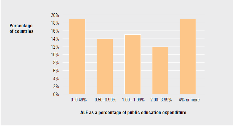 گزارش جهانی آموزش و یادگیری بزرگسالان داده هایی را در مورد مخارج آموزش و یادگیری بزرگسالان به عنوان بخشی از مخارج آموزش عمومی در کشورهای مختلف جمع آوری کرد. نمودار 2 تصویر جهانی مخارج آموزش و یادگیری بزرگسالان را به عنوان درصدی از مخارج آموزش عمومی نشان می دهد.
