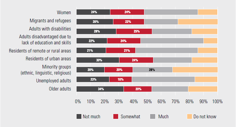 بیشترین اولویت در کشورهای مختلف به بزرگسالانی داده شده است که به دلیل عدم آموزش و مهارت بی انگیزه شده اند (45 درصد از کشورها اعلام کرده اند که این گزینه در اولویت آنها بوده است)، و اولویت دوم مربوط به بزرگسالان بیکار است (44 درصد کشورها این موضوع را اولویت خود اعلام کرده اند)، ساکنان مناطق دور افتاده یا روستایی (44 درصد از کشورها به این گزینه اولویت داده اند) و زنان (38 درصد کشورها زنان را جزء اولویت های خود اعلام کرده اند) در رتبه های بعدی قرار دارند.