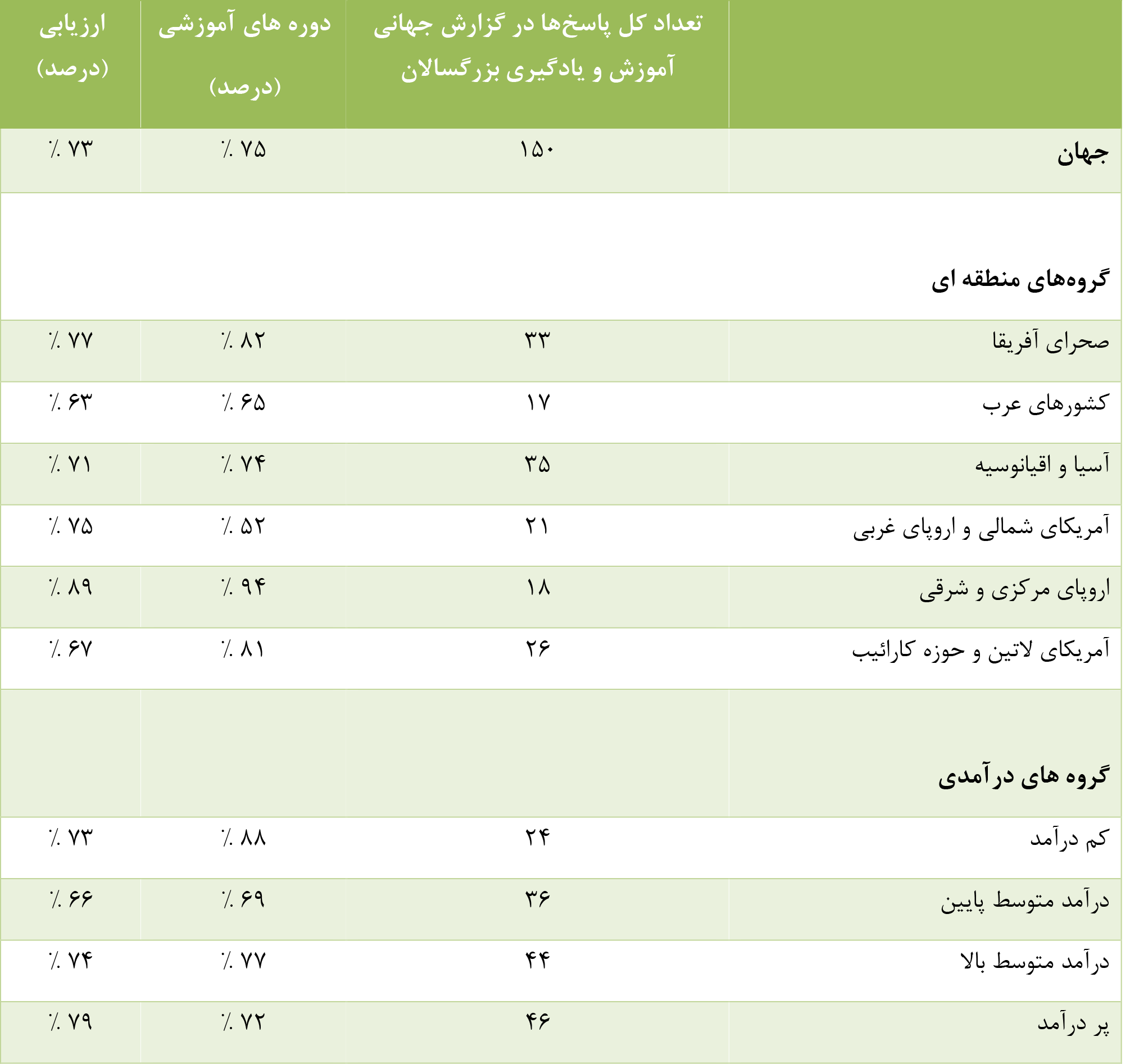پاسخ دهندگان در کشورهای عربی کمترین میزان پیشرفت را در توسعه روش های ارزیابی برنامه های آموزش و یادگیری بزرگسالان گزارش کرده اند (63 درصد).