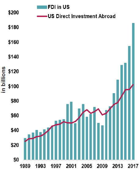 کل سرمایه گذاری مستقیم خارجی انجام شده در آمریکا طی سال 2018 نسبت به سال قبل از آن 18 درصد (51 میلیارد دلار) کاهش یافته و به 226 میلیارد دلار رسیده است. در سال پیش از آن 277 میلیارد دلار سرمایه گذاری خارجی در آمریکا انجام شده بود. در عین حال این کشور همچنان بزرگترین کانون جذب سرمایه گذاری مستقیم خارجی در جهان باقی مانده است.