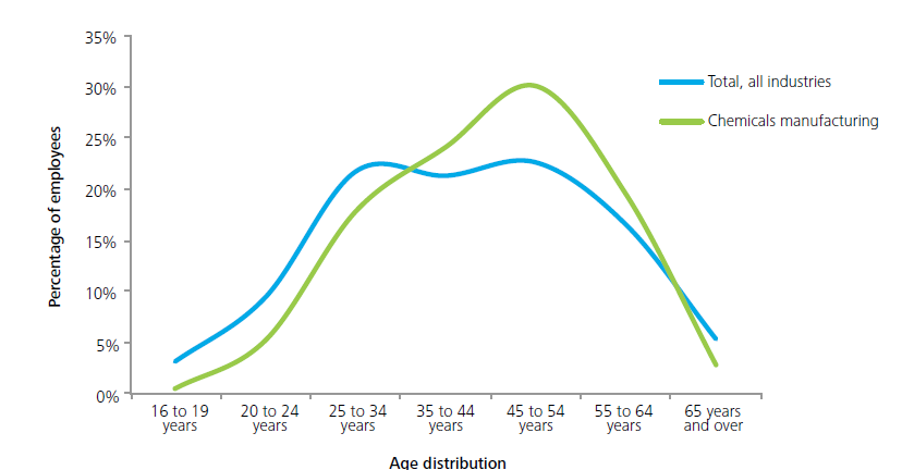 در بسیاری از صنایع، توزیع سنی نیروی کار زنگوله ای شکل یا متقارن است. این بدان معناست که در حالی که درصد بالایی از کارمندان مسن در یک صنعت حضور دارند، به همان نسبت هم نیروی کار جوان در آن صنعت حضور دارند تا به محض بازنشسته شدن افراد مسن جای آنها را پر کنند. اما در صنعت پتروشیمی نیروی کار در دامنه های سنی بالاتر متمرکز شده اند.