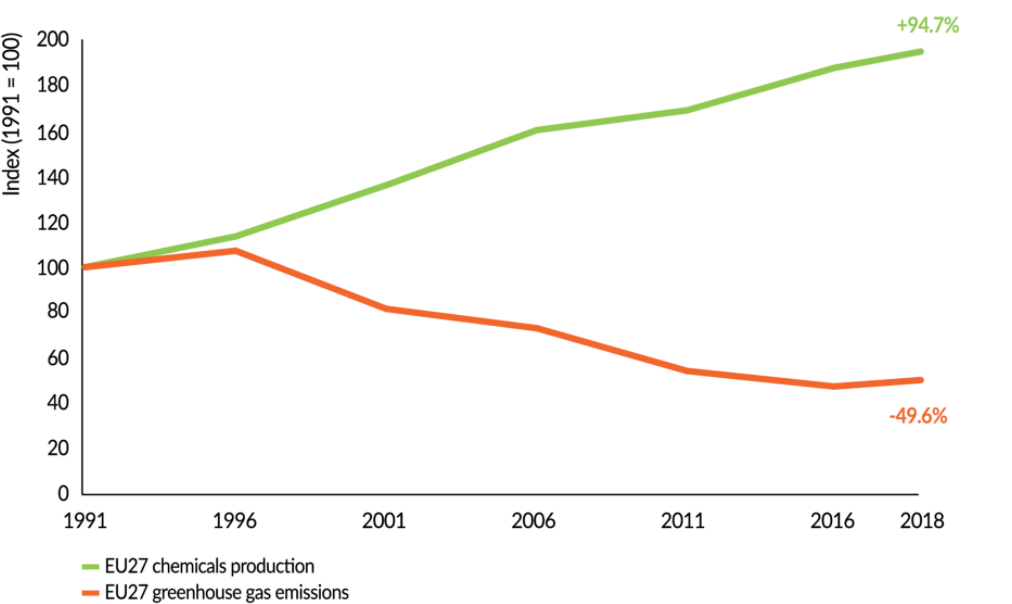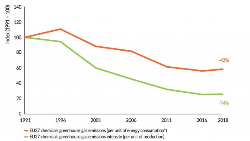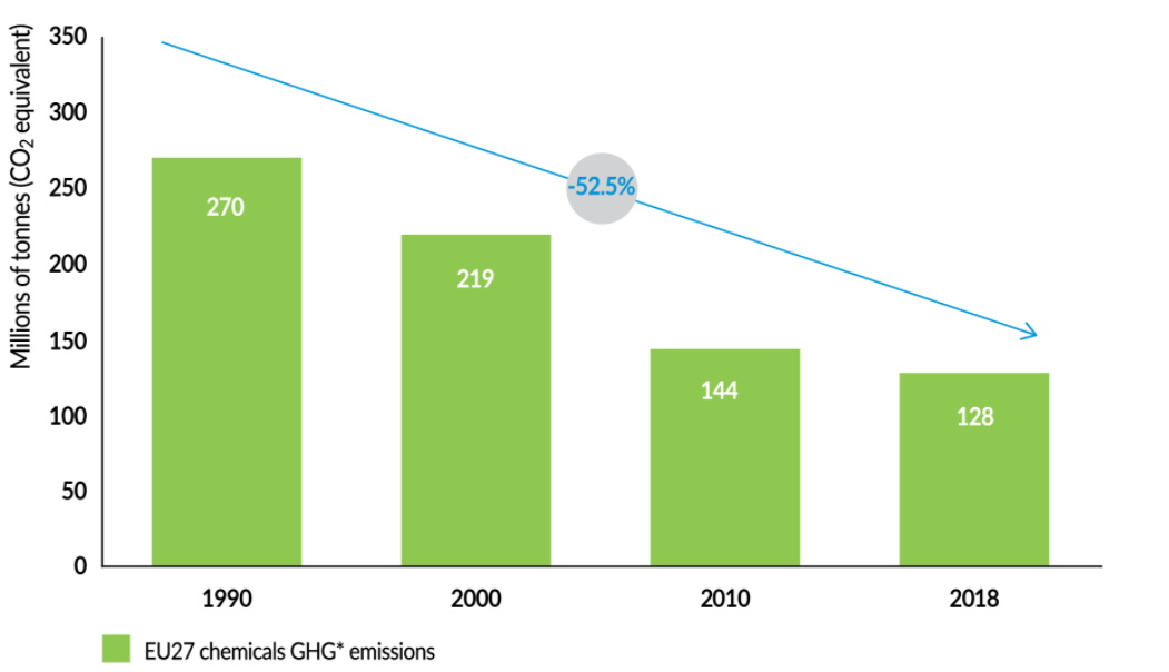 کاهش 50 درصدی انتشار گازهای گلخانه ای بین سال های 1991 و 2018 زمانی مهم تر می شود که توجه داشته باشیم در همین مدت زمان، تولید در صنعت پتروشیمی و مواد شیمیایی اتحادیه اروپا، شامل صنایع داروئی، به اندازه 95 درصد افزایش داشته است.