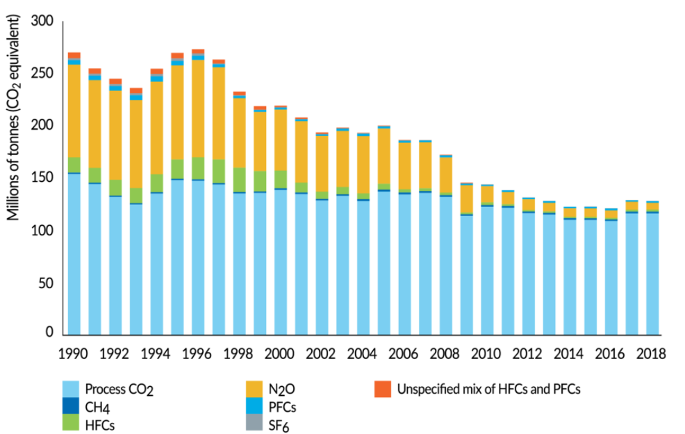 میزان کل گازهای گلخانه ای منتشر شده حاصل از تولید اسید نیتریک بین سال های 1990 تا 2018، به طور متوسط سالانه 9/8 درصد کاهش یافته است. این بدان معناست که از سال 1990 تا کنون بیش از 90 درصد از میزان کل آلاینده های منتشر شده کاسته شده است.