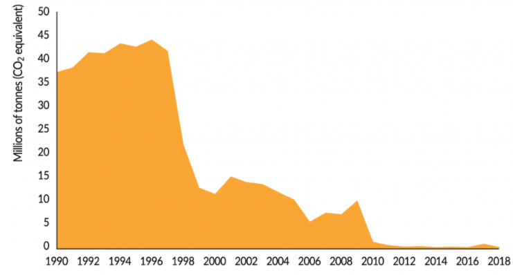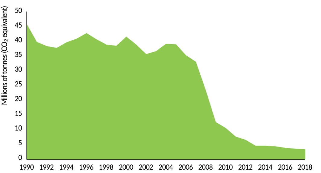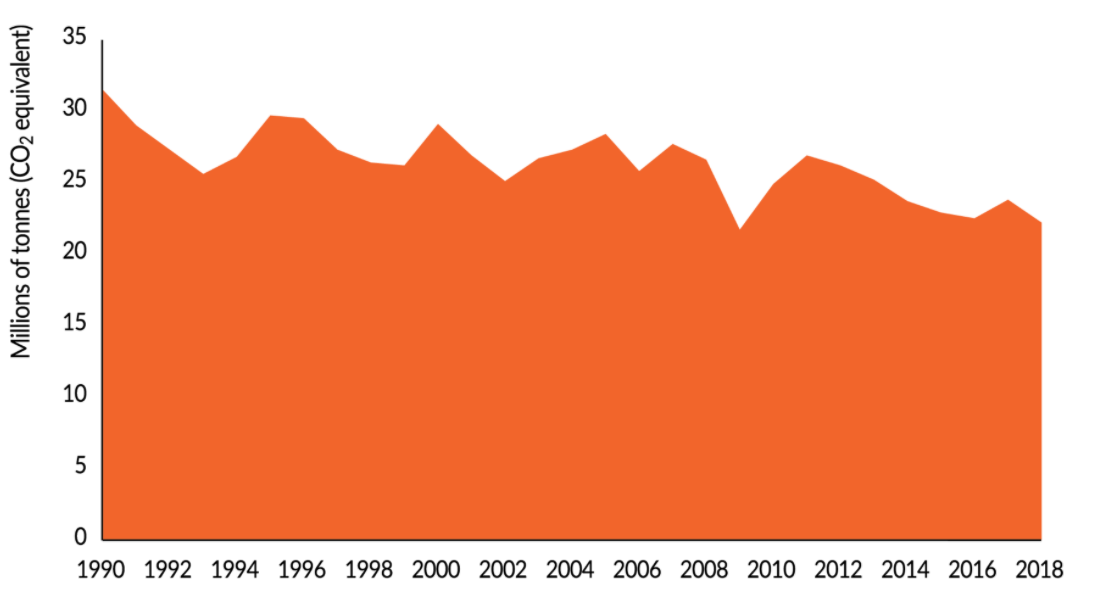 میزان انتشار گازهای گلخانه ای بین سال های 1991 و 2018 به اندازه 42 درصد کاهش یافته است. شدت انتشار گازهای گلخانه ای –انتشار گازهای گلخانه ای به ازای هر واحد تولید- بین سال های 1990 تا 2018 به اندازه 74 درصد کاهش یافت.