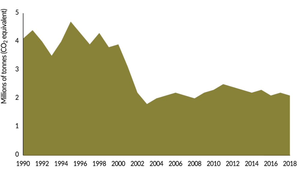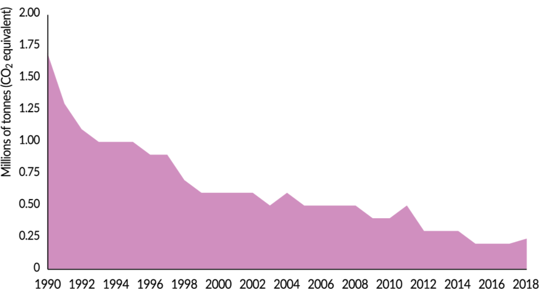 میزان کل گازهای گلخانه ای منتشر شده از سال 1990 تاکنون، به اندازه 0/142 میلیون تن معادل دی اکسید کربن کاهش یافته است. داده ها نشان می دهند که میزان انتشار گاز متان (CH4) در طول این دوره زمانی افزایش یافته است در حالی که میزان انتشار سایر گازهای گلخانه ای مانند دی اکسید کربن، هیدروفلور کربن ها (HFCs)، اکسید نیتروژن، هگزا فلورید سولفور (SF6) و پرفلور کربن ها (PFCs) در همین دوره زمانی کاهش یافته است.
