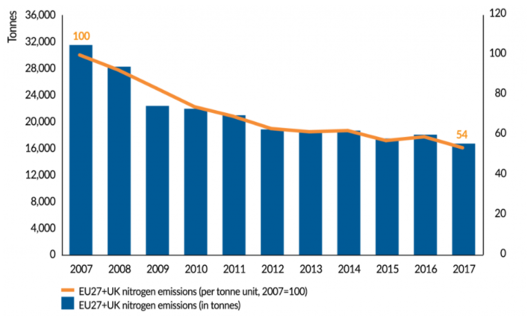 نمودار 11- شدت تولید نیتروژن از سال 2007 تاکنون در اتحادیه اروپا و بریتانیا تقریبا 47 درصد کاهش یافته است