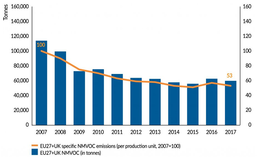 صنعت پتروشیمی از سال 2007 تاکنون شاهد کاهش 47 درصدی انتشار ترکیبات ارگانیک غیرفلزی فرار و غیر متان در هوا بوده است.[3] این نتیجه به دلیل یک سری اقدامات شامل بهینه سازی فرآیندها و بهبود کنترل انتشارات در طول ذخیره سازی و حمل و نقل به دست آمده است.