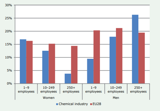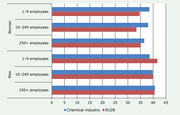 مانند سایر بخشهای صنعتی در ۲۸ کشور عضو اتحادیه اروپا در صنعت پتروشیمی نیز مردان نسبت به زنان ساعات بیشتری را به صورت متوسط کار می کنند ( نمودار ۱). اگرچه لازم به ذکر است که اگر به اندازه های مختلف محل کار توجه کنیم، زنان در صنعت پتروشیمی به صورت متوسط بیش از زنان در سایر بخش های صنعتی در کشورهای عضو اتحادیه اروپا کار می کنند، بیشترین اختلاف مربوط به محل های کار دارای اندازه متوسط است.
