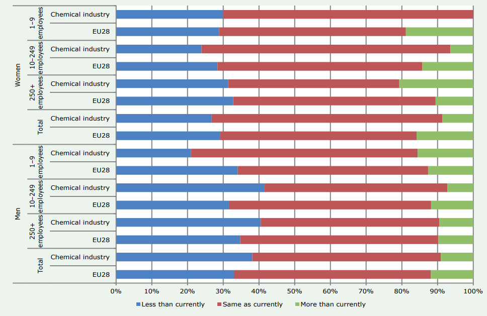 اگر ترجیحات زمان کاری را به طور متوسط با ۲۸ کشور عضو اتحادیه اروپا با صنعت پتروشیمی مقایسه کنیم اختلاف فاحشی از این نظر وجود ندارد ( نمودار ۲)، اگرچه نسبت کارمندانی که ترجیح میدهند ساعات کمتری را کار کنند در مقایسه با متوسط ۲۸ کشور عضو اتحادیه اروپا اندکی بالاتر است ( ۳۵ درصد در مقایسه با ۳۱ درصد).