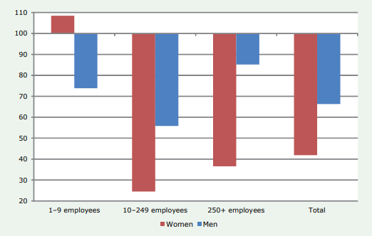 نمودار 3 نشان میدهد که کار کردن در زمانهای غیر معمول ( مانند آخر هفته ها، بعد از شیفت کاری یا در شبها) در همه اندازه های محل های کار به طور قابل توجهی کمتر از متوسط کشورهای عضو اتحادیه اروپا است. اگرچه در بین سایزهای مختلف محلهای کار اختلاف جنسیتی نیز دیده میشود.