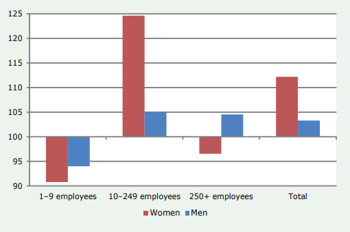 در حالی که در شرکت های کوچک، بیشتر محتمل است که زنان در شرکت های کوچک بیش از مردان در ساعات غیرمعمول کار کنند، در شرکت های متوسط و بزرگ احتمال بیشتری وجود دارد که مردان در ساعات غیرمعمول کار کنند.
