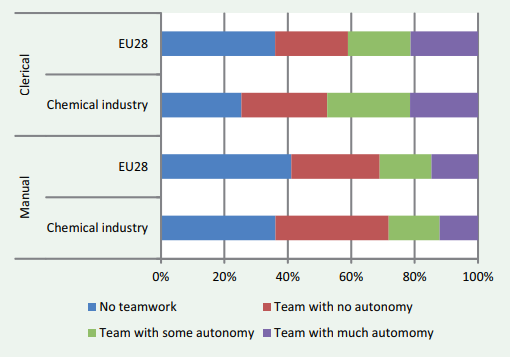 این اختلاف بیش از همه مربوط به کار گروهی بدون استقلال است، چون رقم گزارش شده آن برای صنعت پتروشیمی ۳۰ درصد و برای متوسط کشورهای عضو اتحادیه اروپا ۲۴ درصد است.