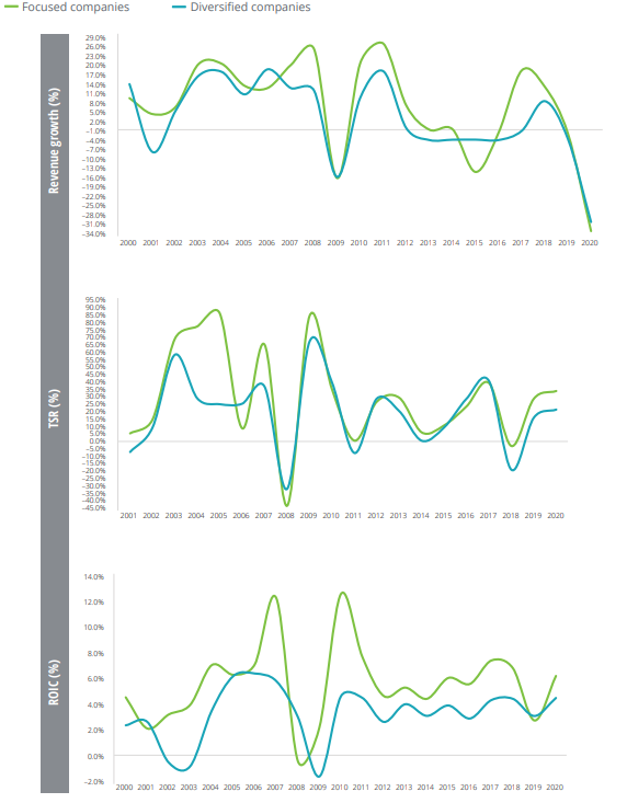 ضمن اینکه شرکتهای متوسط به صورت روتین رشد درآمدشان دوبرابر شرکتهای دارای پرتفوی متنوع است، و همین باعث می شود که میزان بازدهی سرمایه آنها ۷۰ درصد بالاتر باشد و بازدهی سهامداران این شرکت ها نیز ۶۰ درصد بیشتر باشد. ویژگی سوم شرکت های متمرکز این است که در طول چرخه های تجاری نسبت به بقیه شرکت های موجود در صنعت عملکرد بسیار بهتری داشته اند.