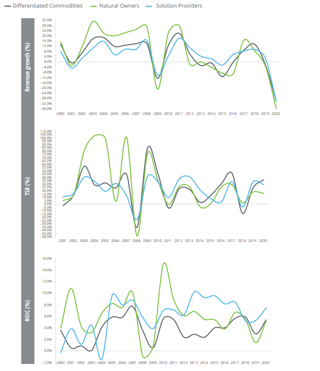 بسیاری از مالکان طبیعی در همه گروههای محصولی شامل الفین ها، پلیمرها، حلال ها، شوینده ها و انواع گازها در موقعیت پیشرو در بازار قرار دارند. در حالیکه عملکرد این شرکت ها در طول دوره زمانی ۲۰ سال گذشته تقریباً بسیار پر نوسان بوده است و دلیل آن این است که نسبت به تغییرات تجاری و چرخه های تجاری بسیار آسیب پذیر هستند رشد درآمد آنها در همین دوره زمانی برای هر سال در حدود ۷.۸ درصد بوده این در حالی است که نرخ رشد متوسط برای کل صنعت در حدود ۵.۶ درصد بوده است.