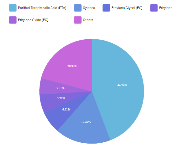 محصولات کلیدی تولید شده در این مجتمع عبارتند از: اسید ترفتالیک خالص (PTA)، زایلن ها، اتیلن گلیکول (EG)، اتیلن، اکسید اتیلن (EO) و غیره. اسید ترفتالیک خالص (PTA) سهم عمده ظرفیت را به خود اختصاص داده است، یعنی 2/44 درصد از کل ظرفیت سالانه مجتمع با 6/11 میلیون تن در پاسکال، پس از آن زایلن ها و اتیلن گلیکول (EG) با 2/17 درصد (5/4mtpa) و 9/6 درصد (8/1mtpa) قرار دارند (نمودار 3).
