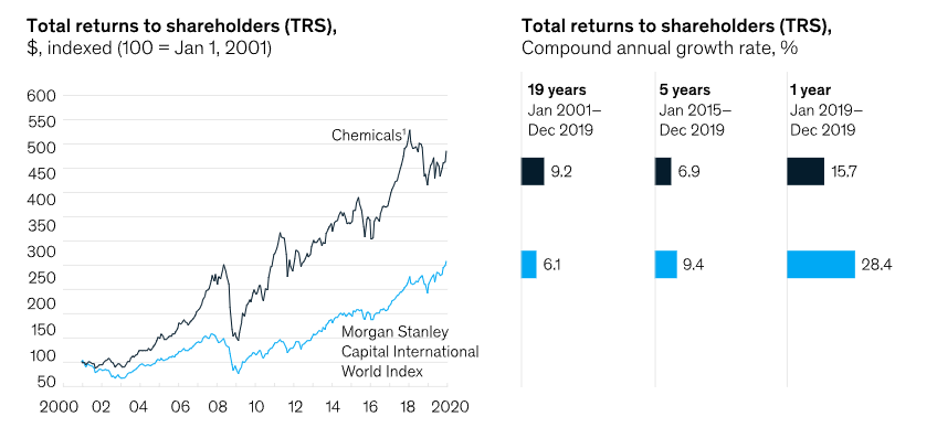 در همان دوره زمانی ارزش صنعت پتروشیمی که با ضرب ارزش شرکت در درآمد قبل از بهره، مالیات و استهلاک به دست می آید، با سرعت بالاتر از ارزشگذاری کل بازار افزایش یافت. این اختلاف از از تقریباً ۱۰ درصد در ابتدای هزاره به نزدیک تصاویر در انتهای سال ۲۰۱۹ رسید. اما با وجود این روندهای مثبت بلندمدت جایگاه صنعت در بازارهای سرمایه رو به افول گذاشت: از سال ۲۰۱۵ تا سال ۲۰۱۹ به میزان ۲.۵ صدم درصد در سال از بقیه بازارها عقب ماند.
