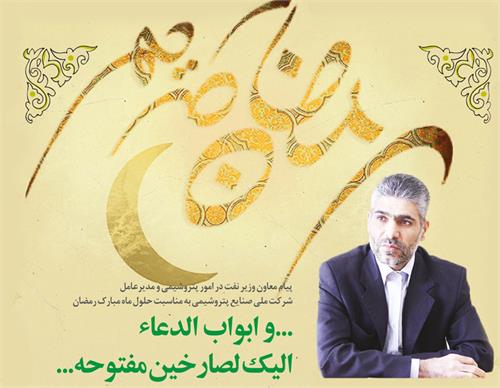 اینجانب ضمن تبریک صمیمانه برای فرارسیدن ماه مبارک رمضان و آرزوی قبولی طاعات و عبادات همۀ همکاران گرامی در این ماه پرفضیلت، از خدای بزرگ توفیق درک اوقات شریفش را برای همگان مسئلت می نمایم. امیدوارم با سربلندی از این امتحان الهی به در آییم و از ذخر بی پایان رمضان، توشه ای برای فردای خویش برگیریم.